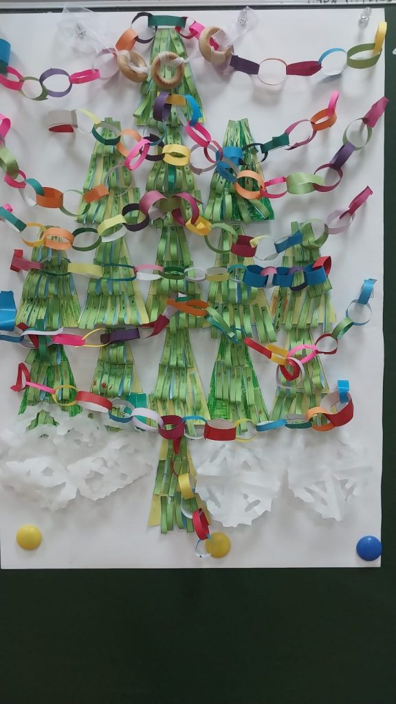 В рамках работы кружка «Доноведение» по теме «Зимняя сказка» учащиеся 1 Б класса выполнили проект «Ёлка своими руками» (из индивидуальных елочек сложили и украсили большую).