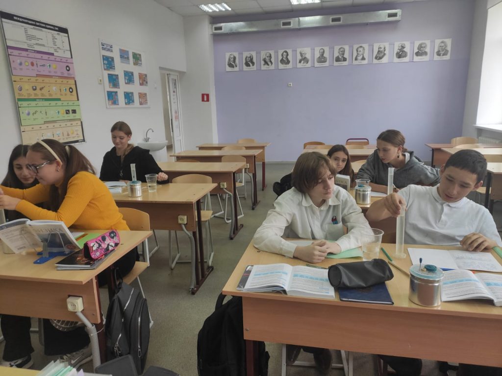 В течение октября 2024 года на базе Точка роста в кабине физики были проведены занятия по программам дополнительного образования. Ученики 7 классов на «Занимательной физике» изучали, как изменится объем воды в мензурке, если в ней растворить кубик сахара, решали задачи на определение скорости движения различных тел.
